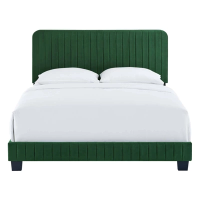 Elevate your master bedroom or guest bedroom style with the luxe texture and glam deco elegance of the Celine King Platform Bed. Adorned with channel tufted detail, the king size headboard of this upholstered bed is padded in dense foam to offer supportive comfort while sitting up resting, relaxing, reading, or watching TV. Upholstered in stain-resistant performance velvet, this platform bed eliminates the need for a box spring with a wood slat support system to allow for ample air circulation and a reinforced center beam and support legs for added durability. A sturdy mattress foundation, this king size platform bed accommodates a variety of mattress styles including innerspring, memory foam, and latex. Assembly required. Weight Limit: 800 lbs.