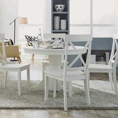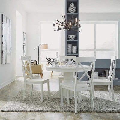 Reserve a table for four every day of the week with this Homestyles Warwick 5-Piece Dining Set. The round table and four dining chairs turn even smaller spaces into vibrant spaces for eating, chatting, or just coming together. The contoured comfort of the chairs is matched only by the easily washable surfaces and overall durability.