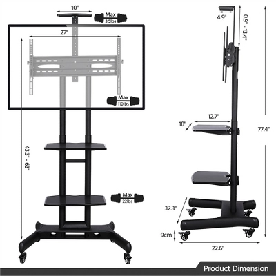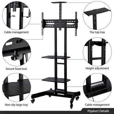 - Watching TV will not be limited in a specific place anymore. This height adjustable mobile TV stand makes it possible! You can raise or lower the TV screen to a comfortable height to reduce pressure on your neck, and back. The flexible TV bracket allows for a 13-degree TV tilt angle adjustment, while its horizontal adjustment makes sure it can perfectly fit TVs ranging from 32″ to 75″. This metal TV stand has four 360° spinners and lockable wheels which help you move and stop the stand easily and smoothly everywhere at any time. The mobile TV cart features three storage shelves for placing devices and accessories. What’s more, its cable management design completely makes cables and wires neat to avoid twisting. TV trolley with wheels is suitable for many occasions, for example, living room, yard, office, meeting room, expo, trade show, hospital, classroom, lecture hall, hotel, bar, gym, etc.