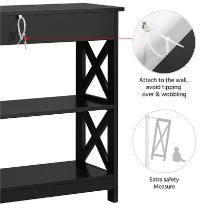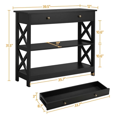- Try this minimal one with a big drawer and 2-layer shelves. Boasting CARB P2 MDF board and pinewood legs covered by water-resistant veneer, this 3-tier console table is stable, safe and easy to maintain. It is designed into a 3-layer structure with 2 open shelves and 1 big drawer, allowing you to accommodate some frequently used items or decorations on it. This 3-tier console table features a minimal and chic style that can harmoniously fit various home or commercial decors. Best of all, it is a budget model that aims to have all your concerns covered.